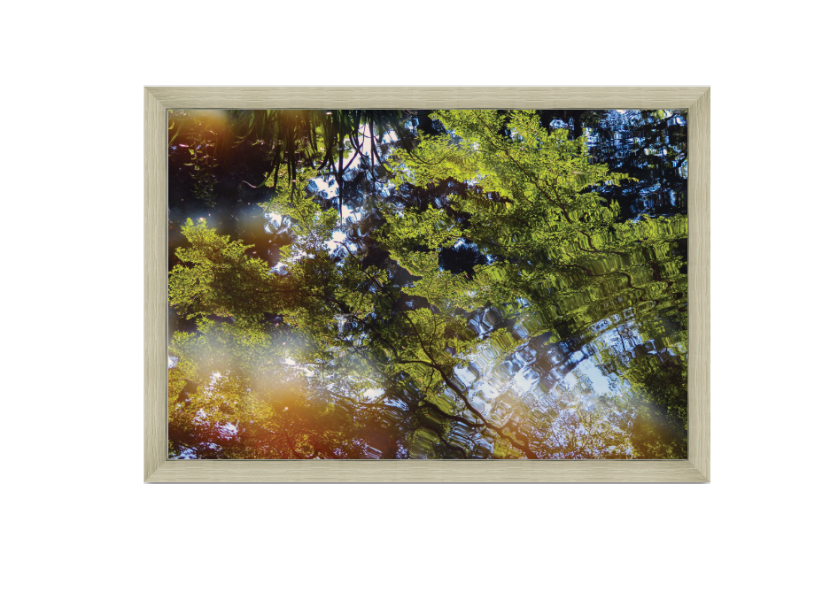 In the grounds of Chuson-ji Buddhist temple, the golden green canopy and pastel blue sky is reflected in the freshwater stream.